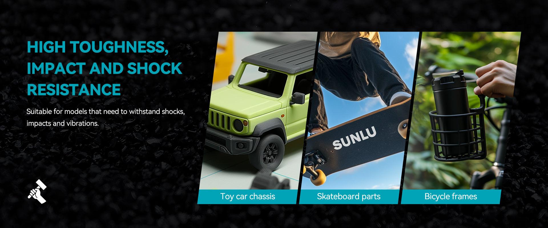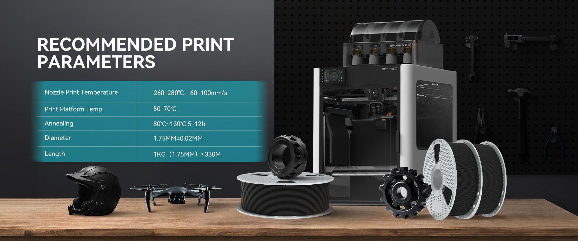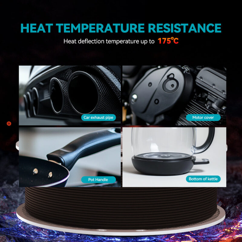 ה-PA12-CF של SUNLU, המהונדס עם חיזוק סיבי פחמן, עומד בטמפרטורות של עד 176°C, מה שמבטיח יציבות בסביבות תובעניות כמו יישומי רכב או תעופה וחלל. הוא מותאם להדפסה בטמפרטורה של 260–280°C עם משטח מחומם ל-50–70°C (יש להשתמש בדבק לצורך הידבקות), ומספק ביצועים אמינים גם תחת לחץ תרמי קיצוני.