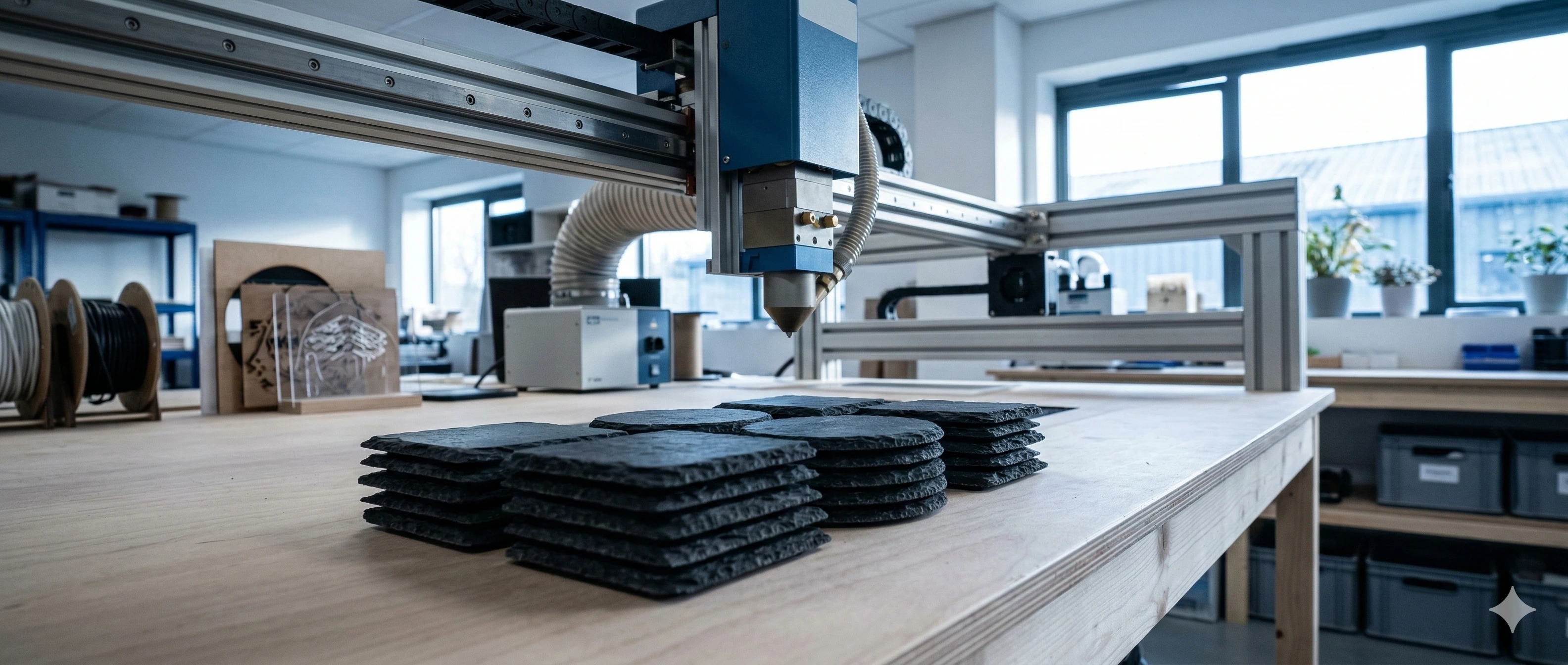 מוצרי שעם שונים: אטמים טכניים, דגם אדריכלי, תחתיות לכוסות ודיפון למגירות על שולחן עבודה.