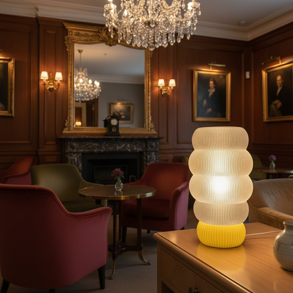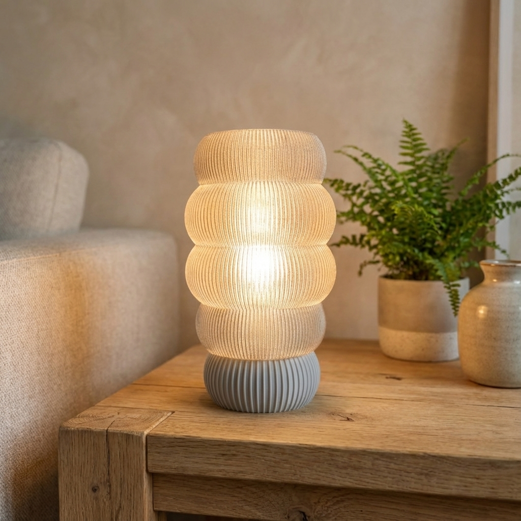 מנורת נימבוס (Nimbus) היא התגלמות הרוך והזרימה, המביאה אל תוך הבית צללית אורגנית המזכירה עננים רכים הנערמים זה על זה. המבנה שלה מורכב מארבע שכבות מעוגלות ותפוחות, המתרחבות בהדרגה ויוצרות מראה פיסולי הרמוני ומרגיע. הגוף כולו עטוף במרקם חריצים אנכיים עדינים המדגישים את הקימורים המושלמים של המנורה ומעניקים לה עומק ויזואלי מבלי לשבור את הקו המעוגל. כאשר היא דולקת, האור בוקע מבעד למבנה השכבות באופן רך ומלטף, מה שהופך את הנימבוס לפריט מושלם ליצירת אווירה שלווה על שולחן לצד הספה או בחדר השינה.