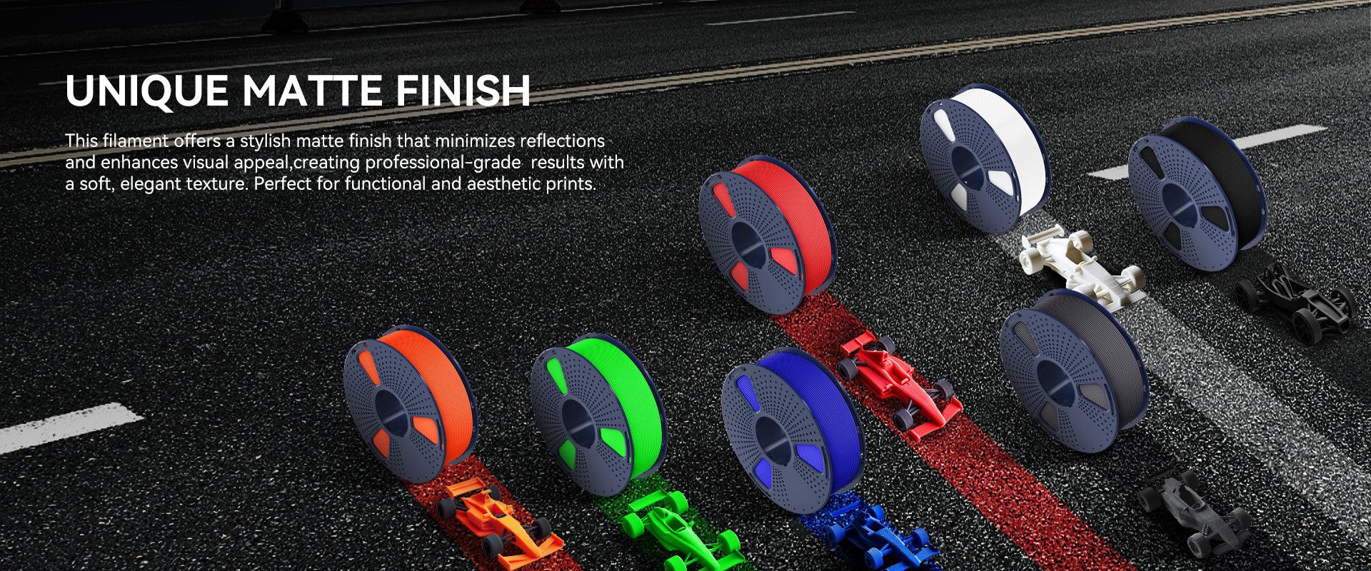 גימור מט (Matte) ייחודי פילמנט זה מעניק גימור מט אופנתי הממזער השתקפויות ומשדרג את המראה הויזואלי, ליצירת תוצאות ברמה מקצועית עם טקסטורה רכה ואלגנטית. מושלם הן להדפסות פונקציונליות והן להדפסות אסתטיות.
